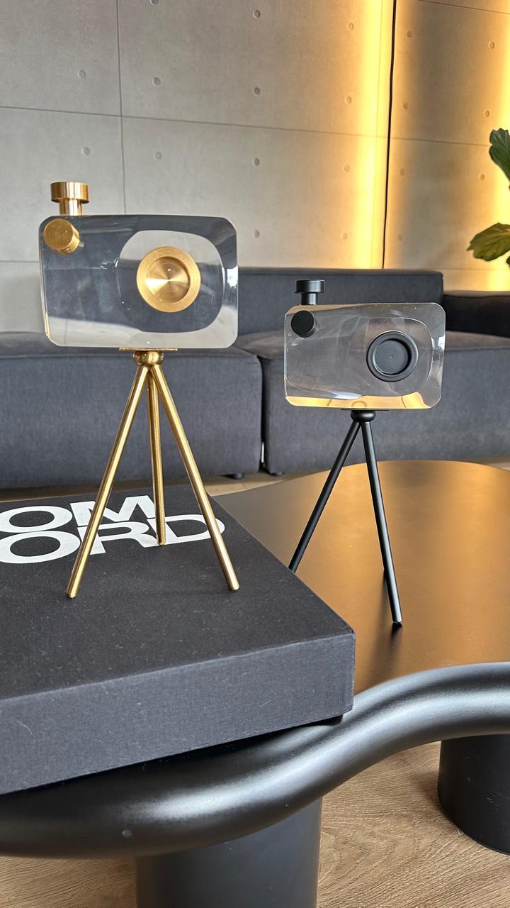 Articulo decorativo camara cristal detalles negro 13cm* 4,5cm* 10cm* base 17cm